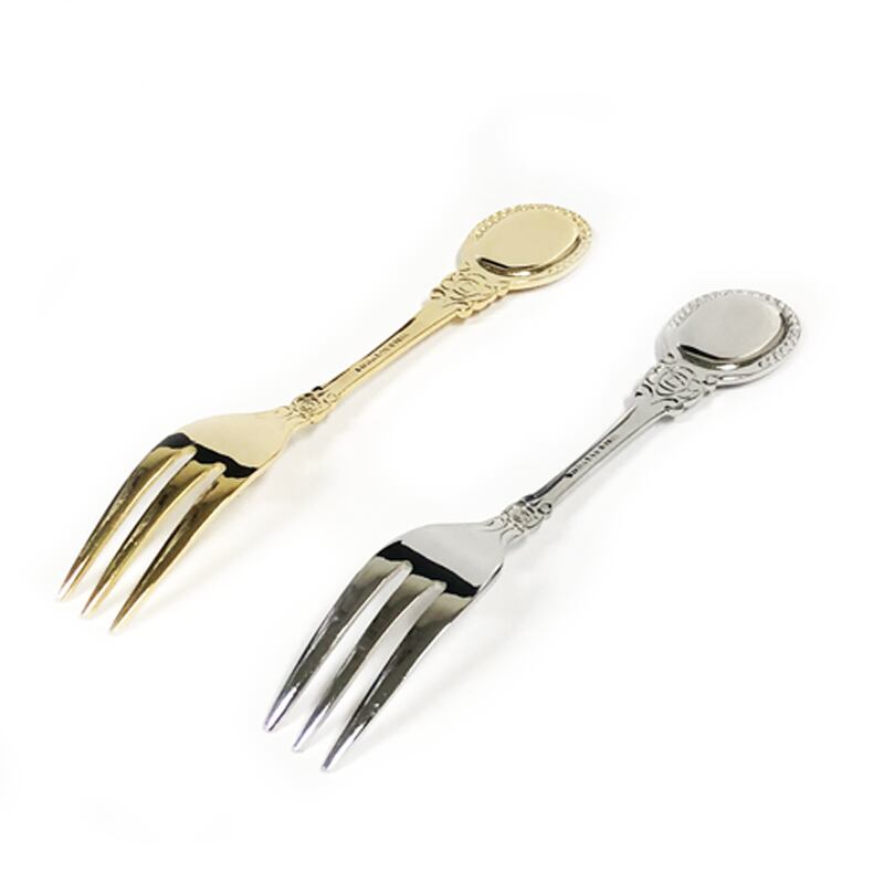 軸や柄尻に緻密な装飾が施された、高級感のあるステンレス製のフォークです。